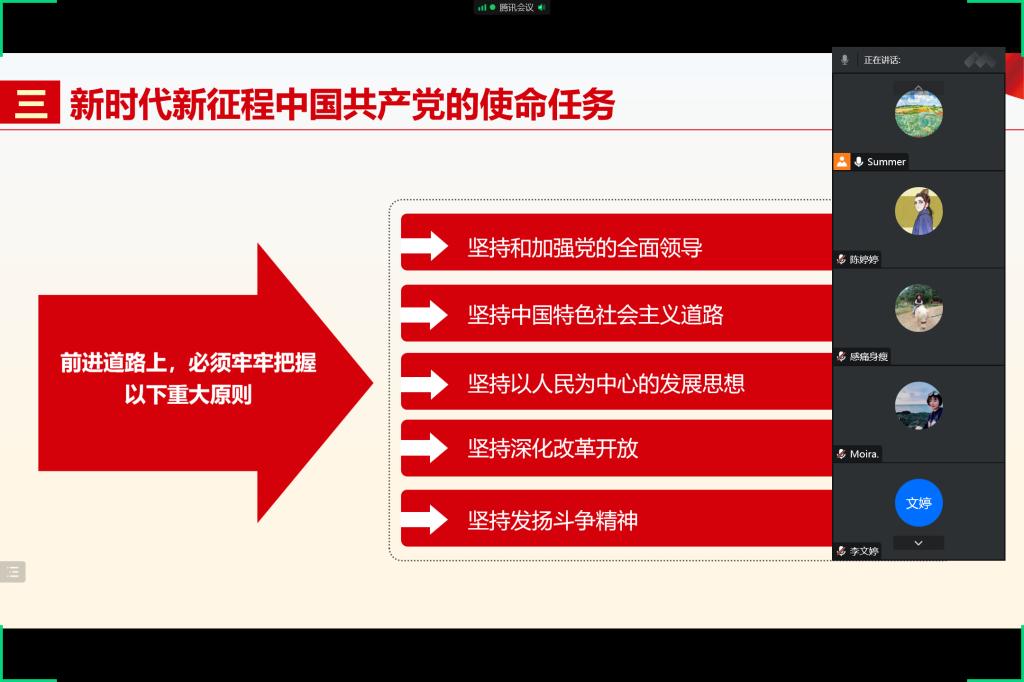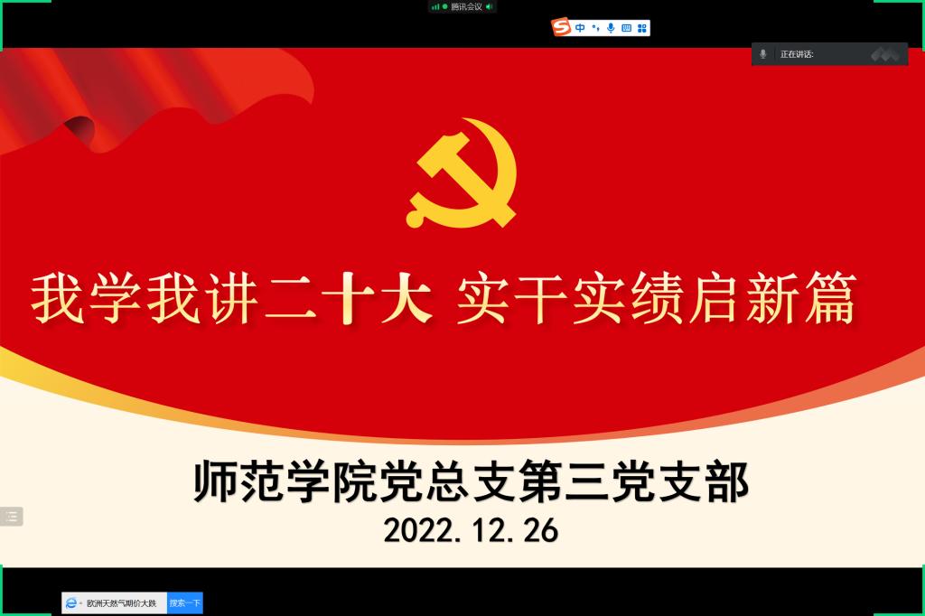 12月26日,新冠肺炎疫情来势汹汹,打破幸福平静的生活。在此特殊情况下,为深入学习贯彻党的二十大精神,进一步激发全体党员爱党爱国情怀,保证疫情防控与党建活动两不误,qm球盟会网站qm球盟会网站党总支第三党支部将主题党日活动搬到线上开展,于12月26日进行以“我学我讲二十大 实干实绩启新篇”为主题的线上主题党日活动。活动由支部书记夏椰柯主持,全体党员教师准时参加。