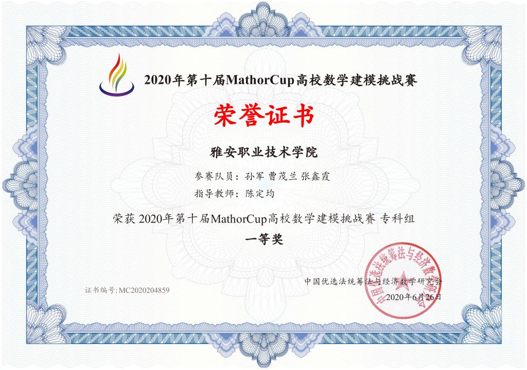 qm球盟会网站员工荣获2020年高校数学建模挑战赛专科组国家一等奖