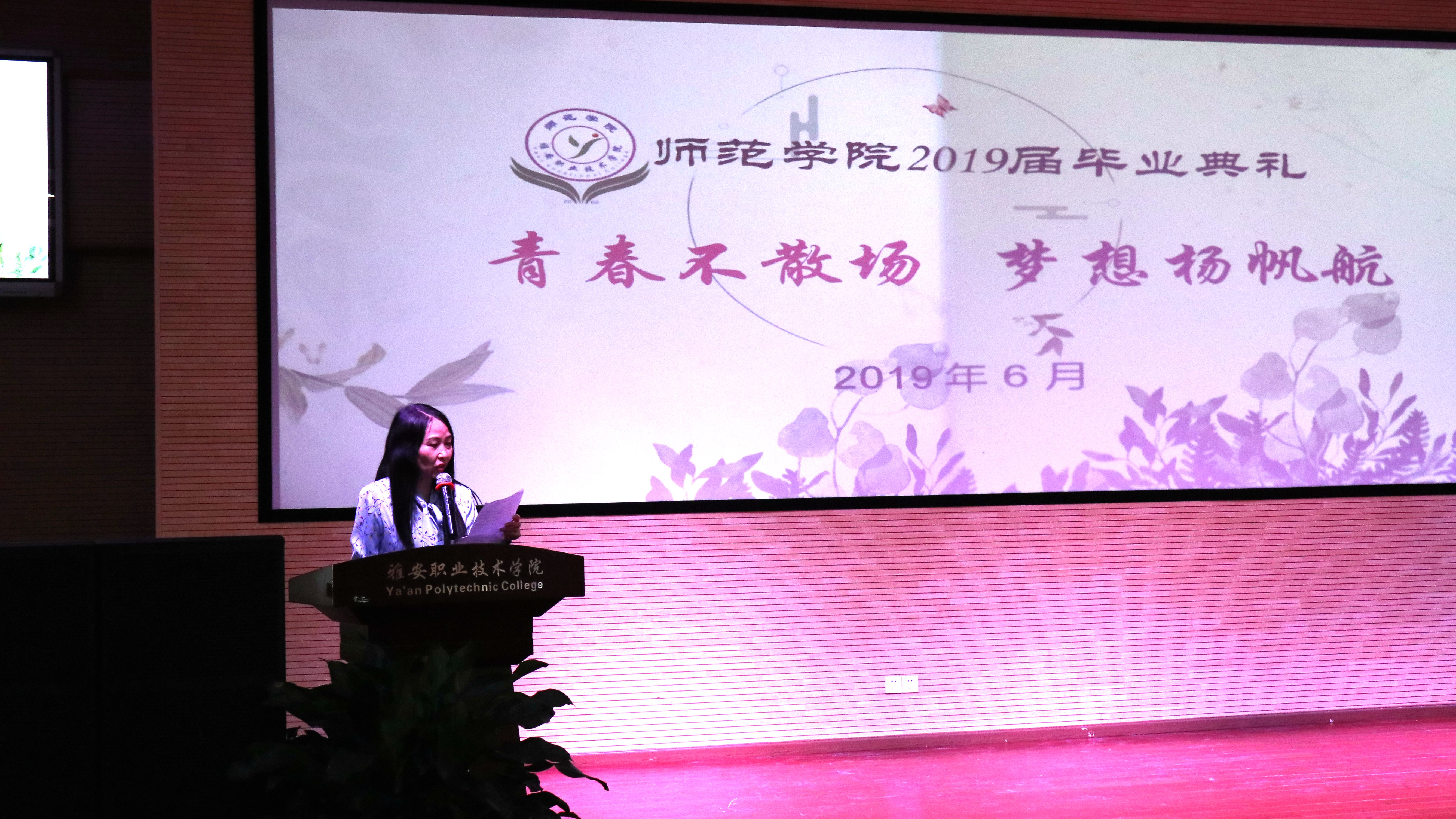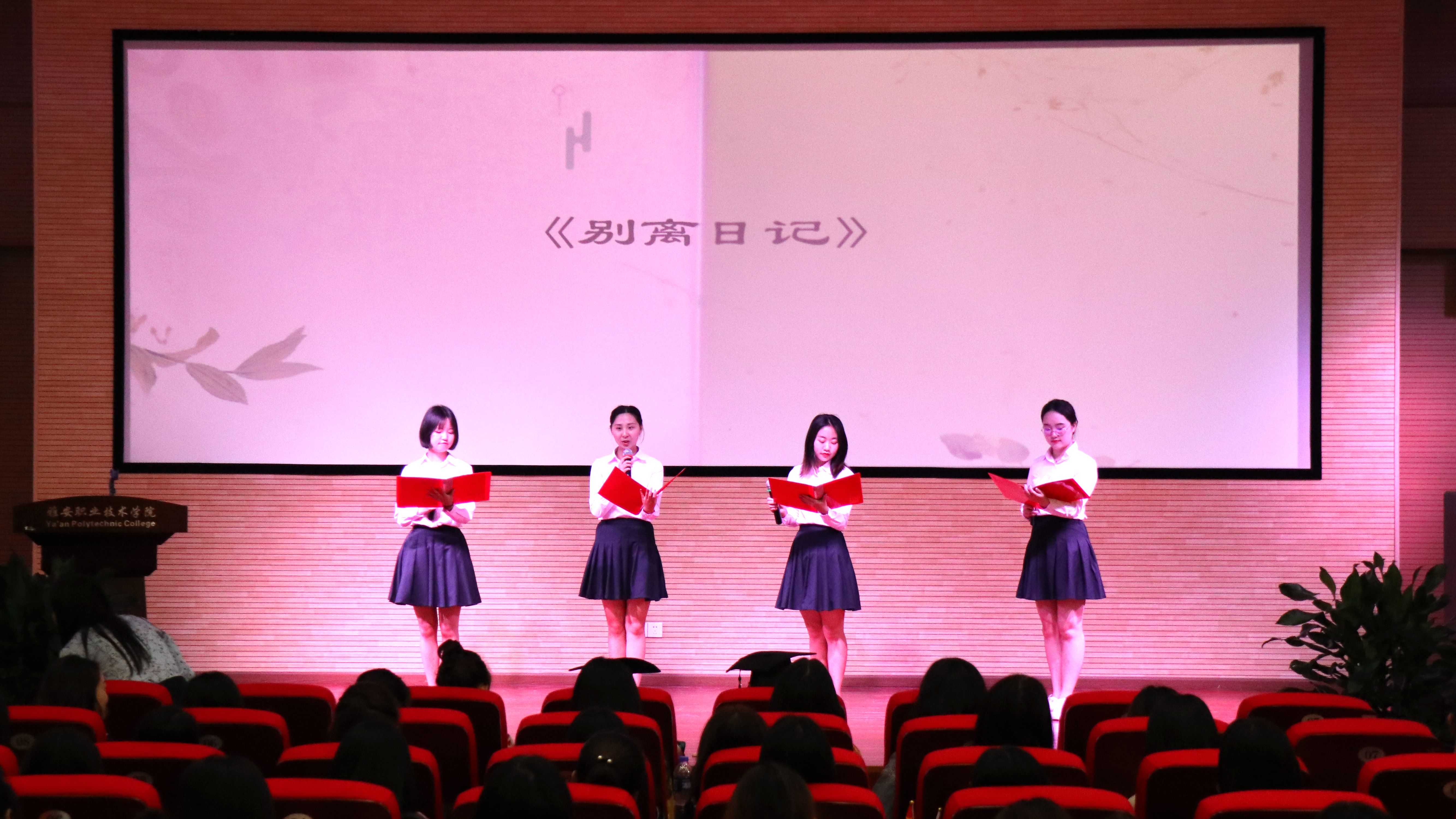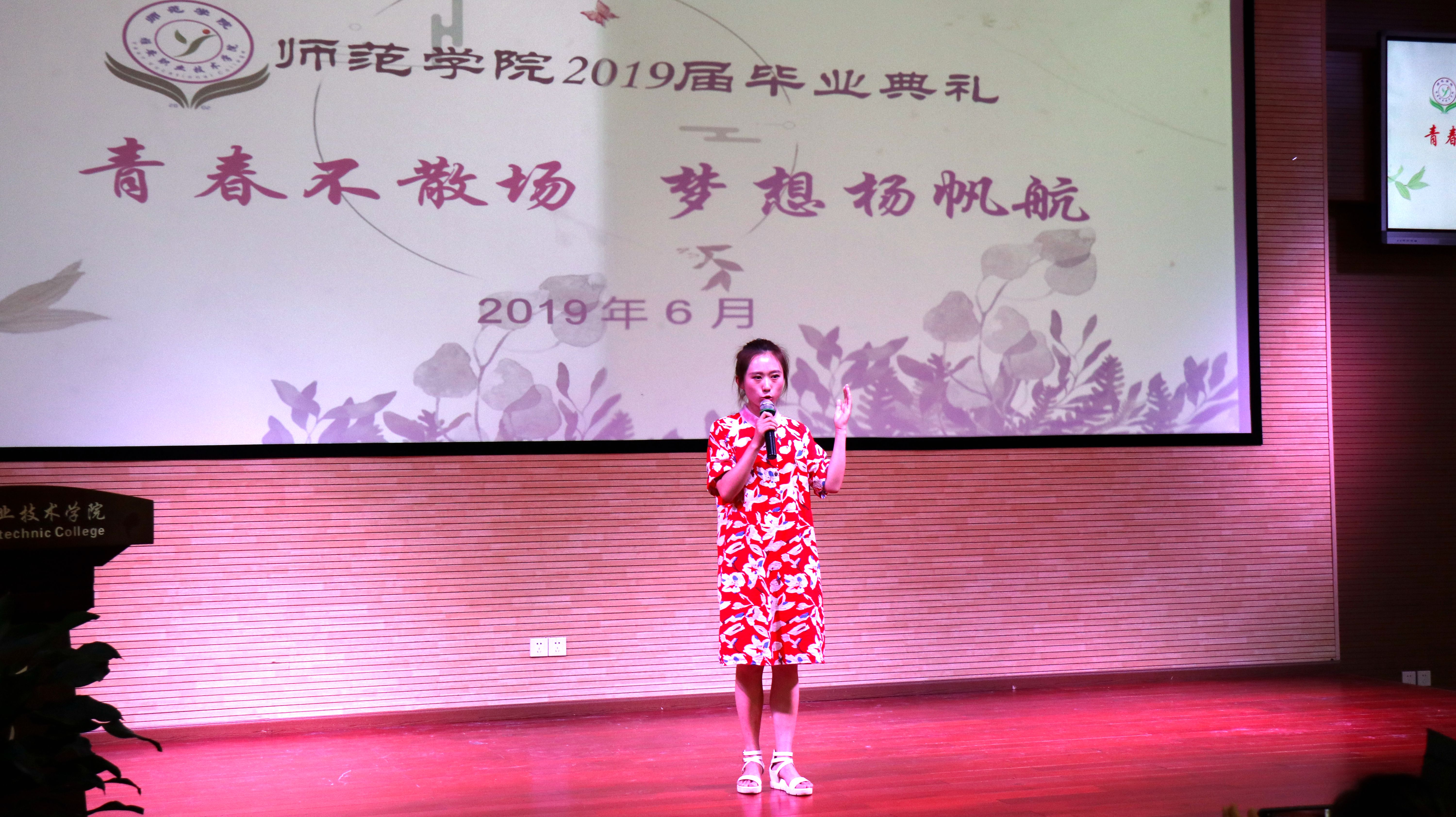 毕业生在典礼上诗朗诵《别离日记》,表现出对老员工活满满的回忆及对母校和老师的感谢。教师代表郑婉秋发表毕业寄语,希望毕业生们在今后的工作当中把“厚德、重能、求是、创新”的校训发扬光大,常怀感恩之心,不忘母校的培养和老师们的谆谆教诲。