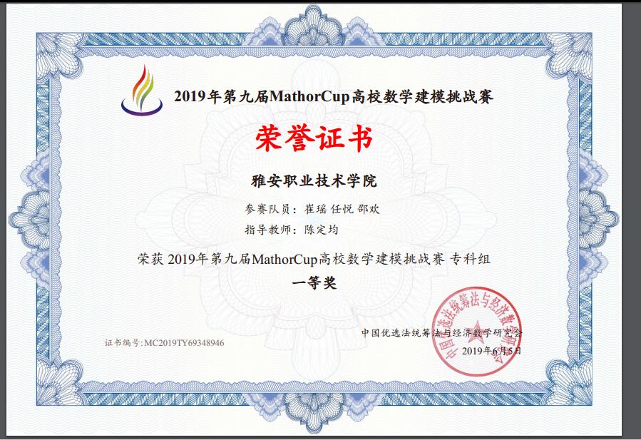 近日,从2019年第九届MathorCup高校数学建模挑战赛组委会传来喜讯,qm球盟会网站员工在此次数学建模挑战赛中荣获专科组国家一等奖1项、二等奖1项、三等奖3项。