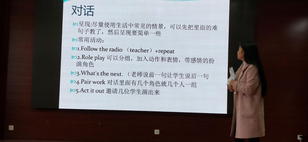 首先,两位老师分别介绍了在课堂及教学过程运用到的方法及策略。在课堂导入环节可以运用游戏导入法,歌曲导入法,以及复习旧知导入等导入方法。在教学环节中运用更多创新的教学方法而不是仅仅局限于传统的教学方法,创新型的教学方法更能引起员工的兴趣,从而让课堂氛围更加活跃,寓教于乐。在教学单词的过程中运用实物教学,单词卡片教学,游戏教学等方法,让员工在玩中学。在讲解句型结构时采用情景教学法,让员工更加生动形象的体会到当时的情景,更好的掌握句型解构及什么时候运用此句型。