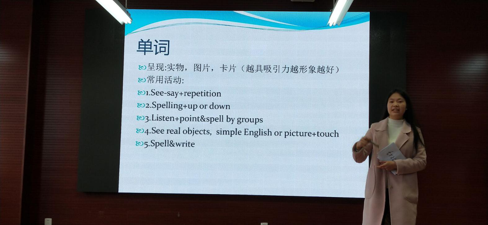 其次,曹慧芹老师给我们上了一堂四季(spring summer autumn winter)的示范课.在导入环节运用提问导入的方法,让员工对四季产生好奇,然后运用PPT教学四季的单词及句型。运用了情景教学法,小组活动法,游戏教学法,并及时对员工进行表扬和鼓励,提高了员工的自信。在总结环节运用歌曲的形式,复习了本堂课的教学知识。石现琼老师教学了歌谣的教学方法。教学歌曲时应注意员工的记忆程度及学习进度,采用了小组教学的方法,让员工体会到了学习英语歌谣的乐趣并掌握了相关单词。