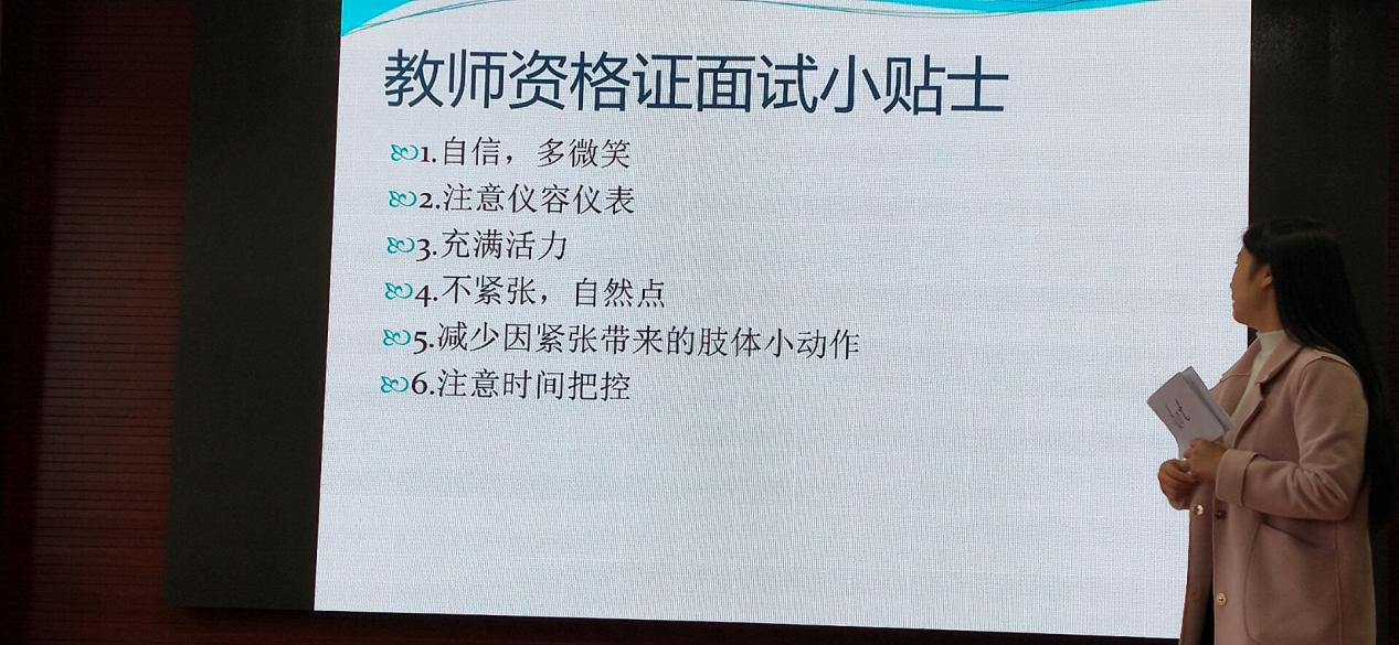 最后,两位老师分别讲解了教团队格证面试技巧。并且亲自示范了在教团队格面试时怎样在短时间内写教案并设计出更加适合教学的教学活动。后来与班级员工进行了面对面交流,耐心的为同学们交流了工作以及生活中的经验。